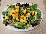 Homemade mango salsa, lettuce, tomatoes and shredded cheese.