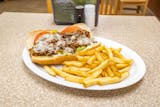 Thin-sliced steak with American cheese, onions, peppers, and mushrooms