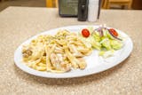 Crisp romaine lettuce tossed in Caesar dressing topped with chicken.