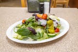 Tomatoes, cucumbers, onions, olives, and feta cheese in an olive oil dressing.